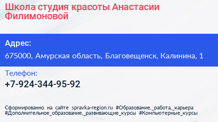 Школа-студия красоты Анастасии Филимоновой по адресу 675000, Амурская область, Благовещенск, Калинина, 1 в дальнейшем Организация, размещена в следующих категориях: