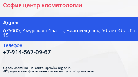 София, центр косметологии по адресу 675000, Амурская область, Благовещенск, 50 лет Октября, 15 в дальнейшем Организация, размещена в следующих категориях: