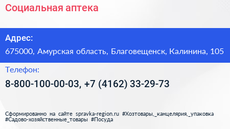 Социальная аптека по адресу 675000, Амурская область, Благовещенск, Калинина, 105 в дальнейшем Организация, размещена в следующих категориях: