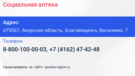 Социальная аптека по адресу 675027, Амурская область, Благовещенск, Василенко, 7 в дальнейшем Организация, размещена в следующих категориях: