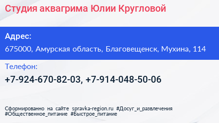 Студия аквагрима Юлии Кругловой по адресу 675000, Амурская область, Благовещенск, Мухина, 114 в дальнейшем Организация, размещена в следующих категориях: