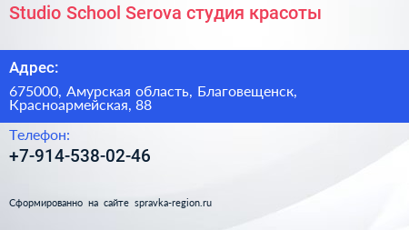 Studio & School Serova, студия красоты по адресу 675000, Амурская область, Благовещенск, Красноармейская, 88 в дальнейшем Организация, размещена в следующих категориях: