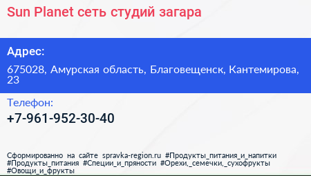 Sun Planet, сеть студий загара по адресу 675028, Амурская область, Благовещенск, Кантемирова, 23 в дальнейшем Организация, размещена в следующих категориях: