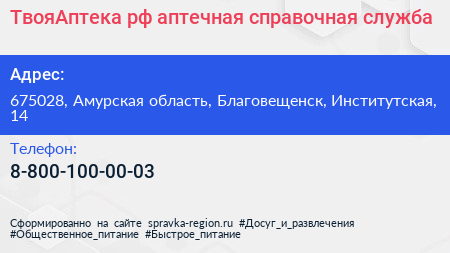 ТвояАптека.рф, аптечная справочная служба по адресу 675028, Амурская область, Благовещенск, Институтская, 14 в дальнейшем Организация, размещена в следующих категориях: