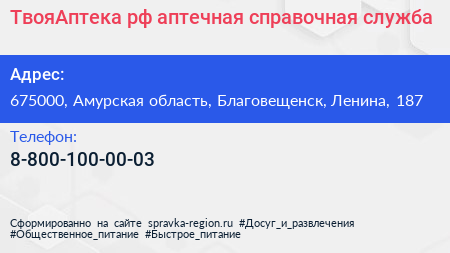 ТвояАптека.рф, аптечная справочная служба по адресу 675000, Амурская область, Благовещенск, Ленина, 187 в дальнейшем Организация, размещена в следующих категориях: