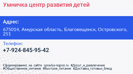 Умничка, центр развития детей по адресу 675014, Амурская область, Благовещенск, Островского, 251 в дальнейшем Организация, размещена в следующих категориях: