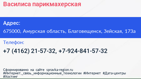 Василиса, парикмахерская по адресу 675000, Амурская область, Благовещенск, Зейская, 173а в дальнейшем Организация, размещена в следующих категориях: