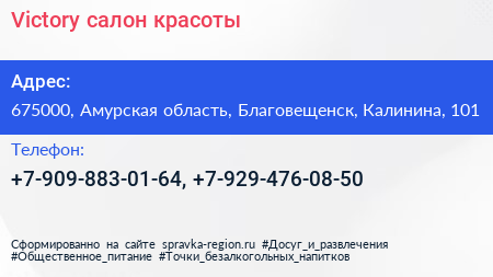 Victory, салон красоты по адресу 675000, Амурская область, Благовещенск, Калинина, 101 в дальнейшем Организация, размещена в следующих категориях: