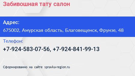 Забивошная, тату-салон по адресу 675002, Амурская область, Благовещенск, Фрунзе, 48 в дальнейшем Организация, размещена в следующих категориях: