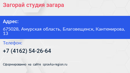 Загорай, студия загара по адресу 675028, Амурская область, Благовещенск, Кантемирова, 13 в дальнейшем Организация, размещена в следующих категориях: