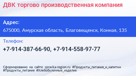 ДВК, торгово-производственная компания по адресу 675000, Амурская область, Благовещенск, Конная, 135 в дальнейшем Организация, размещена в следующих категориях: