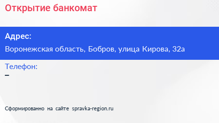 Открытие, банкомат по адресу Воронежская область, Бобров, улица Кирова, 32а в дальнейшем Организация, размещена в следующих категориях: