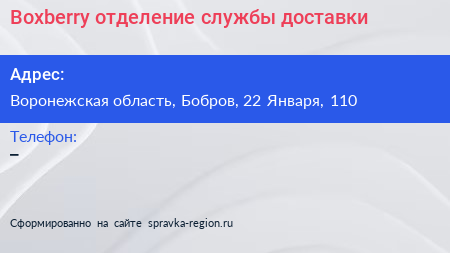 Boxberry, отделение службы доставки по адресу Воронежская область, Бобров, 22 Января, 110 в дальнейшем Организация, размещена в следующих категориях: