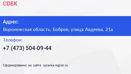CDEK по адресу Воронежская область, Бобров, улица Авдеева, 21а в дальнейшем Организация, размещена в следующих категориях: