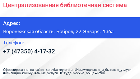 Централизованная библиотечная система по адресу Воронежская область, Бобров, 22 Января, 136а в дальнейшем Организация, размещена в следующих категориях: