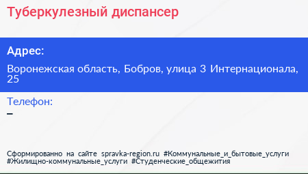 Туберкулезный диспансер по адресу Воронежская область, Бобров, улица 3 Интернационала, 25 в дальнейшем Организация, размещена в следующих категориях:
