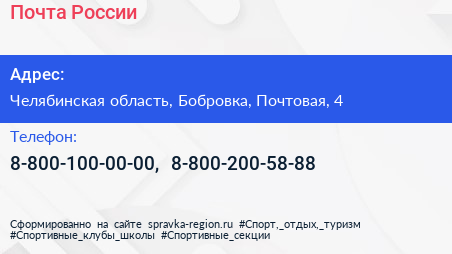 Почта России по адресу Челябинская область, Бобровка, Почтовая, 4 в дальнейшем Организация, размещена в следующих категориях: