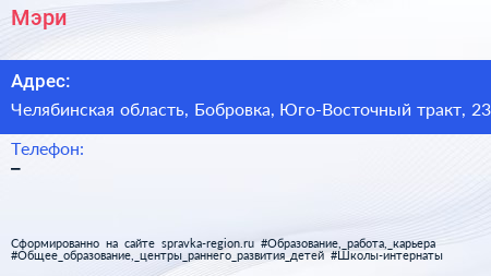 Мэри по адресу Челябинская область, Бобровка, Юго-Восточный тракт, 23 в дальнейшем Организация, размещена в следующих категориях:
