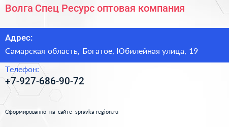 Волга-Спец-Ресурс, оптовая компания по адресу Самарская область, Богатое, Юбилейная улица, 19 в дальнейшем Организация, размещена в следующих категориях: