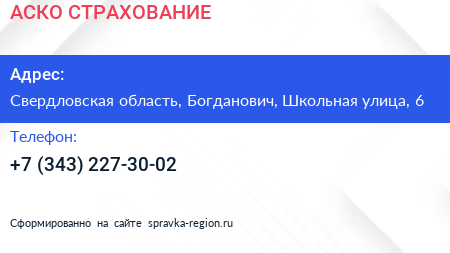 АСКО-СТРАХОВАНИЕ по адресу Свердловская область, Богданович, Школьная улица, 6 в дальнейшем Организация, размещена в следующих категориях: