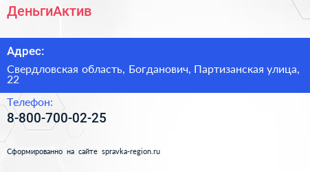 ДеньгиАктив по адресу Свердловская область, Богданович, Партизанская улица, 22 в дальнейшем Организация, размещена в следующих категориях:
