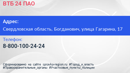 ВТБ 24, ПАО по адресу Свердловская область, Богданович, улица Гагарина, 17 в дальнейшем Организация, размещена в следующих категориях: