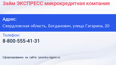 Займ ЭКСПРЕСС, микрокредитная компания по адресу Свердловская область, Богданович, улица Гагарина, 20 в дальнейшем Организация, размещена в следующих категориях: