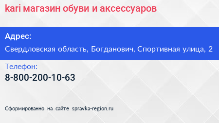 kari, магазин обуви и аксессуаров по адресу Свердловская область, Богданович, Спортивная улица, 2 в дальнейшем Организация, размещена в следующих категориях: