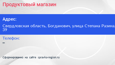 Продуктовый магазин по адресу Свердловская область, Богданович, улица Степана Разина, 39 в дальнейшем Организация, размещена в следующих категориях: