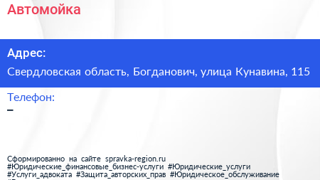 Автомойка по адресу Свердловская область, Богданович, улица Кунавина, 115 в дальнейшем Организация, размещена в следующих категориях: