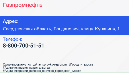 Газпромнефть по адресу Свердловская область, Богданович, улица Кунавина, 1 в дальнейшем Организация, размещена в следующих категориях: