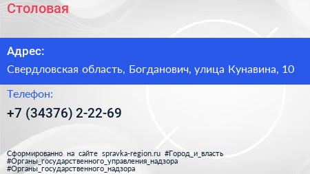 Столовая по адресу Свердловская область, Богданович, улица Кунавина, 10 в дальнейшем Организация, размещена в следующих категориях: