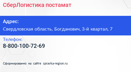 СберЛогистика, постамат по адресу Свердловская область, Богданович, 3-й квартал, 7 в дальнейшем Организация, размещена в следующих категориях: