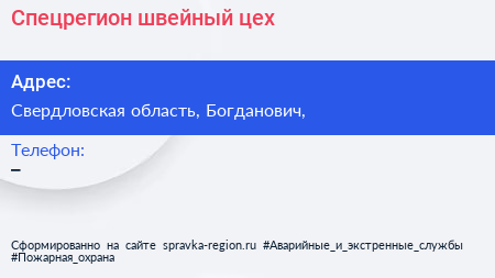 Спецрегион, швейный цех по адресу Свердловская область, Богданович, в дальнейшем Организация, размещена в следующих категориях: