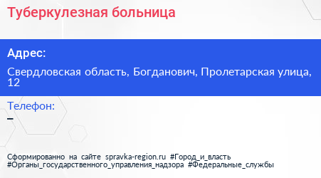 Туберкулезная больница по адресу Свердловская область, Богданович, Пролетарская улица, 12 в дальнейшем Организация, размещена в следующих категориях: