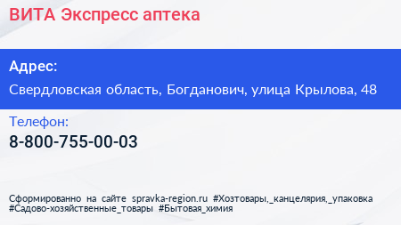 ВИТА Экспресс, аптека по адресу Свердловская область, Богданович, улица Крылова, 48 в дальнейшем Организация, размещена в следующих категориях: