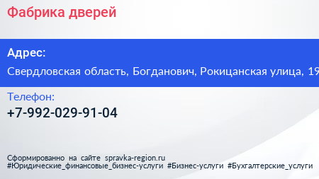 Фабрика дверей по адресу Свердловская область, Богданович, Рокицанская улица, 19 в дальнейшем Организация, размещена в следующих категориях: