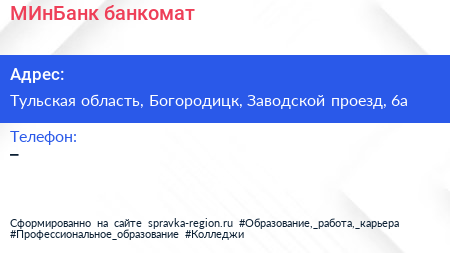 МИнБанк, банкомат по адресу Тульская область, Богородицк, Заводской проезд, 6а в дальнейшем Организация, размещена в следующих категориях:
