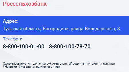 Россельхозбанк по адресу Тульская область, Богородицк, улица Володарского, 3 в дальнейшем Организация, размещена в следующих категориях: