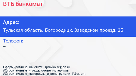ВТБ, банкомат по адресу Тульская область, Богородицк, Заводской проезд, 2Б в дальнейшем Организация, размещена в следующих категориях: