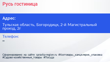 Русь, гостиница по адресу Тульская область, Богородицк, 2-й Магистральный проезд, 2г в дальнейшем Организация, размещена в следующих категориях: