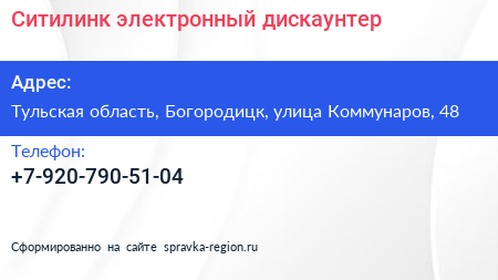 Ситилинк, электронный дискаунтер по адресу Тульская область, Богородицк, улица Коммунаров, 48 в дальнейшем Организация, размещена в следующих категориях: