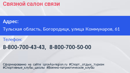 Связной, салон связи по адресу Тульская область, Богородицк, улица Коммунаров, 61 в дальнейшем Организация, размещена в следующих категориях: