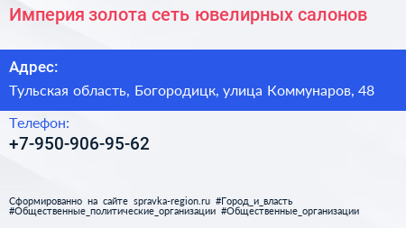 Империя золота, сеть ювелирных салонов по адресу Тульская область, Богородицк, улица Коммунаров, 48 в дальнейшем Организация, размещена в следующих категориях: