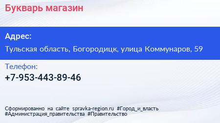 Букварь, магазин по адресу Тульская область, Богородицк, улица Коммунаров, 59 в дальнейшем Организация, размещена в следующих категориях: