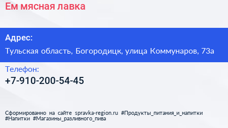Ем, мясная лавка по адресу Тульская область, Богородицк, улица Коммунаров, 73а в дальнейшем Организация, размещена в следующих категориях:
