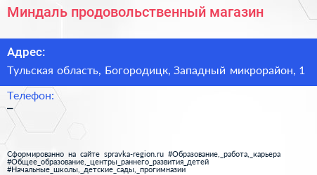 Миндаль, продовольственный магазин по адресу Тульская область, Богородицк, Западный микрорайон, 1 в дальнейшем Организация, размещена в следующих категориях: