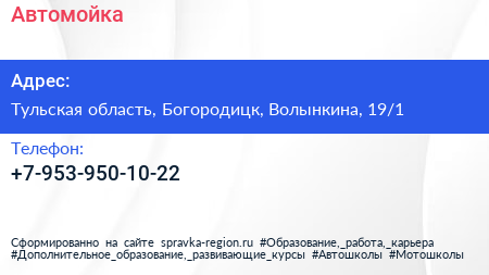 Автомойка по адресу Тульская область, Богородицк, Волынкина, 19/1 в дальнейшем Организация, размещена в следующих категориях: