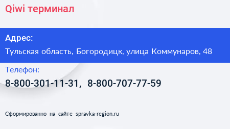 Qiwi, терминал по адресу Тульская область, Богородицк, улица Коммунаров, 48 в дальнейшем Организация, размещена в следующих категориях: