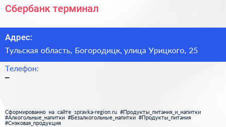 Сбербанк, терминал по адресу Тульская область, Богородицк, улица Урицкого, 25 в дальнейшем Организация, размещена в следующих категориях: